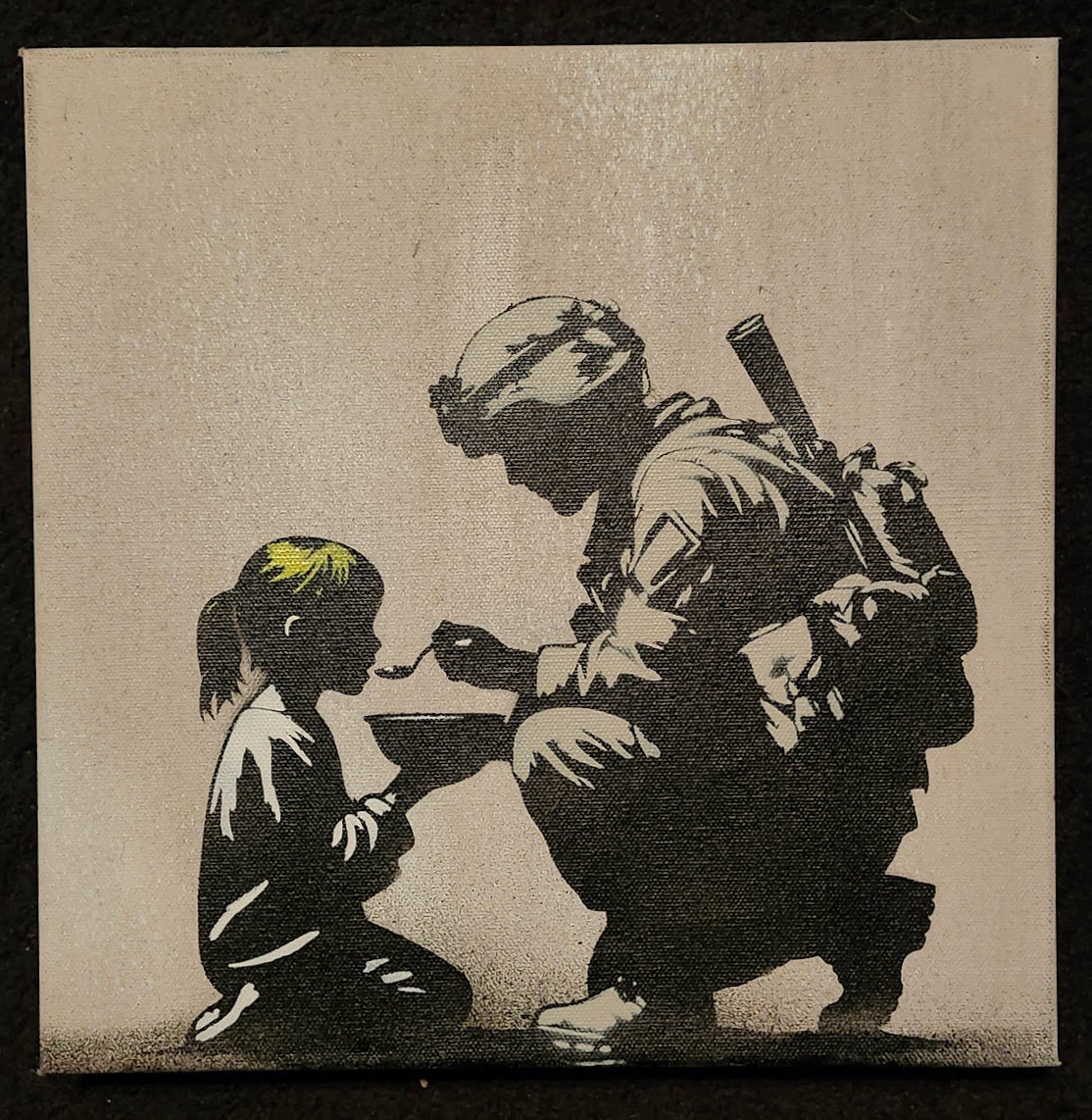 'Feed The Girl'. Banksy Hates Me. 2024. 12x12" gallery stretched deep canvas. One of a kind artwork. Spray paint on canvas.