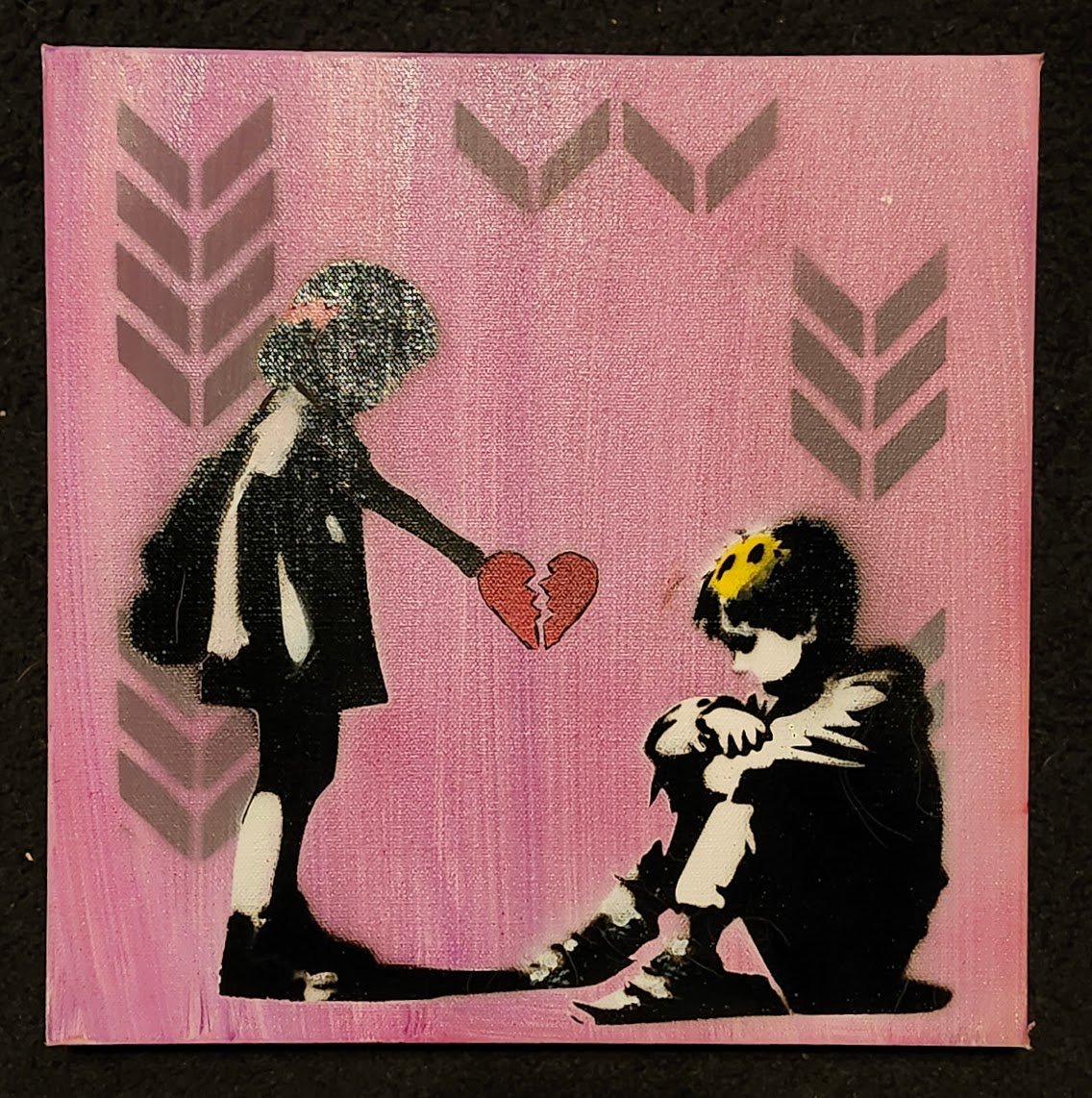 'The Give Back'. Banksy Hates Me. 2024. 12x12" gallery stretched deep canvas. One of a kind artwork. Spray paint on canvas.